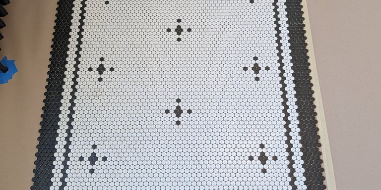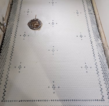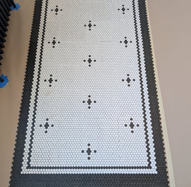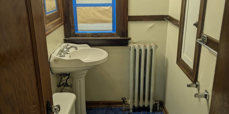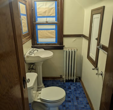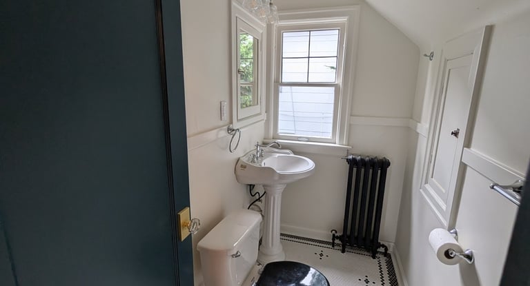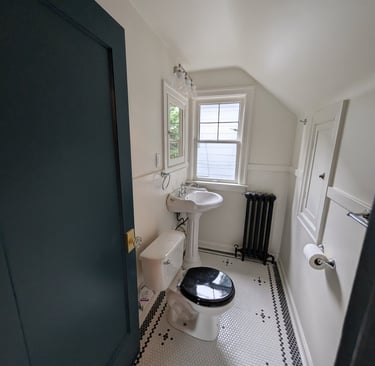 "Complete Bathroom Remodel with Retro-Modern Aesthetics." We executed a complete bathroom renovation project, achieving a perfect balance between modern functionality and the charm of classic design. Key project highlights include: Installation of Honeycomb Mosaic Flooring: Replacement of the existing flooring with white hexagonal mosaic tiles featuring black floral details, executed with a precise and symmetrical border pattern. Renovation of Walls and Woodwork: Replacement of baseboards, window frames, and dark wood doors with glossy white finishes. Application of high-contrast deep petrol blue paint to the main door and cast iron radiator. Plumbing and Fixture Updates: Installation of new chrome faucets, towel bars, and a vintage-style doorknob. Integration of a high-gloss black toilet seat. Period Design Details and Finishes: Retro push-button light switches and an elegant three-light spherical pendant lamp above the mirror significantly enhance the lighting and overall aesthetic. Restoration of Key Elements: The original pedestal sink and toilet were preserved and restored, achieving seamless integration with the new environment.