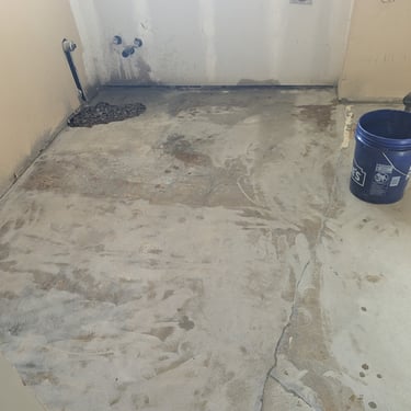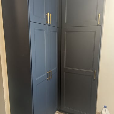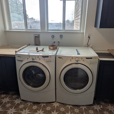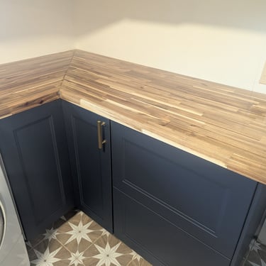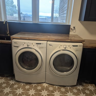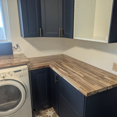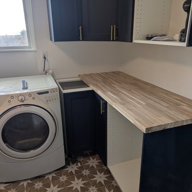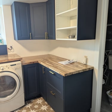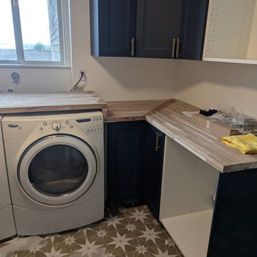 "Who said doing laundry is boring? We elevated the design of this utility area with a bold combination of textures and colors. Statement Flooring: We installed ceramic tile flooring with a geometric star pattern in sand and white tones, which becomes the visual focal point and creates a sense of spaciousness. Elegant Contrast: The dark blue cabinets contrast perfectly with the light wood countertops and gold hardware, achieving a trendy nautical-modern look. Custom Solution: We designed a continuous countertop that 'embraces' the washer and dryer, optimizing every square inch and concealing the connections for a clean finish."