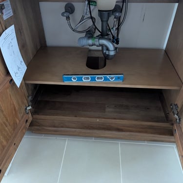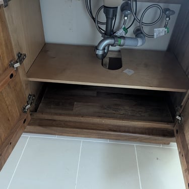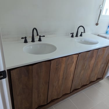 We transformed this bathroom from an outdated style to a completely modern one. The Challenge: We removed an old double vanity with a laminate countertop and updated the entire layout. The Solution: We installed a modern, floating vanity with textured natural wood doors, which contrast perfectly with the new gray tile floor. The Detail: We installed an elegant white quartz countertop with undermount sinks and gooseneck faucets in a matte black finish, achieving a clean and sophisticated look.