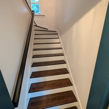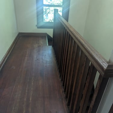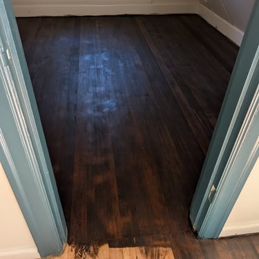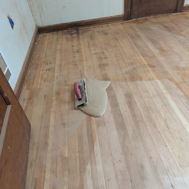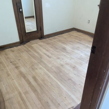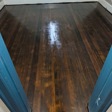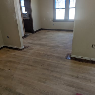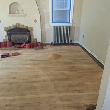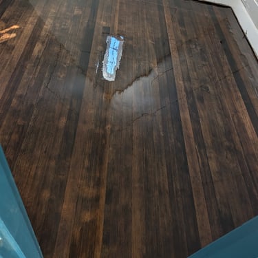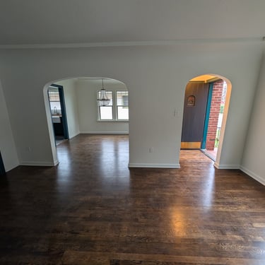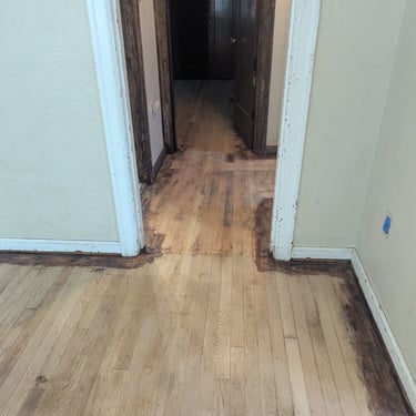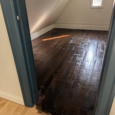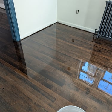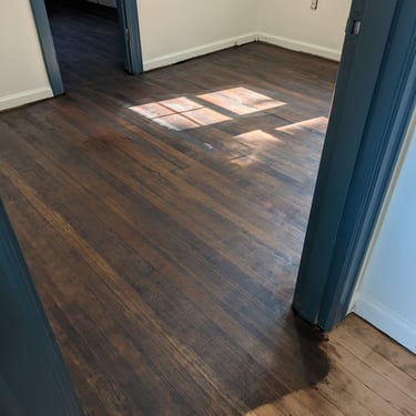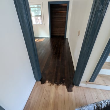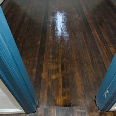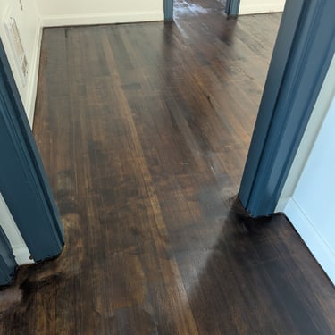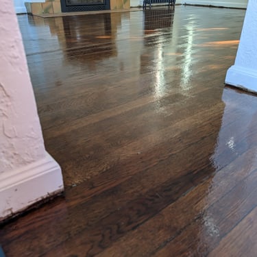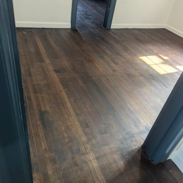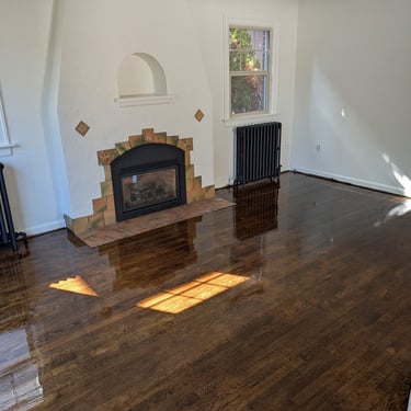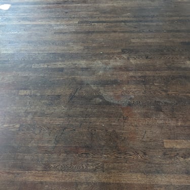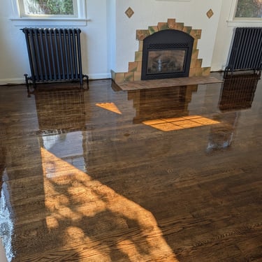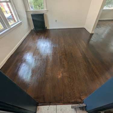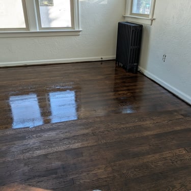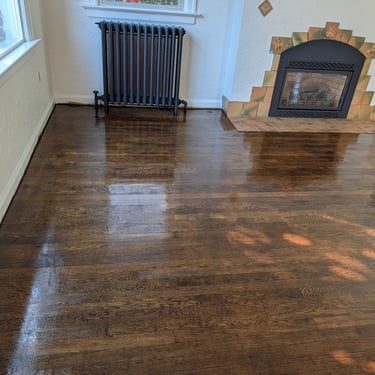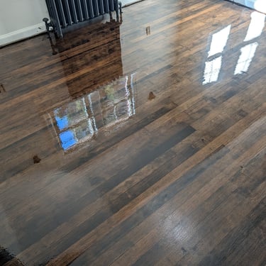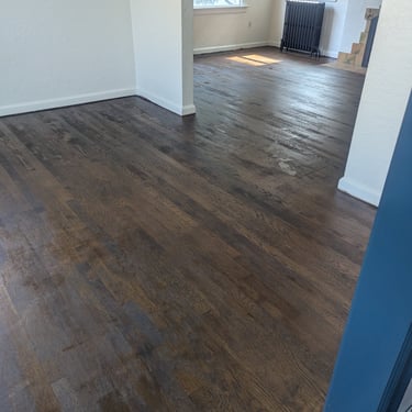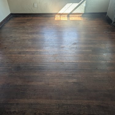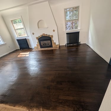 "Don't replace your home's history, let us restore it. In this project, we rescued a hardwood floor that showed years of wear, scratches, and discoloration. Precision Sanding: We used high-end machinery to remove layers of old varnish and level the surface, revealing the healthy, virgin wood underneath. Repair and Caulking: We applied a specialized wood filler across the entire surface to seal cracks and gaps between the boards, ensuring a smooth, leak-free floor. Custom Staining: We applied a dark walnut stain that highlights the wood's natural grain, adding warmth and sophisticated depth. High-Gloss Sealing: We finished with layers of high-strength polyurethane for a mirror-like finish that not only looks incredible but also protects the floor from daily wear and tear."