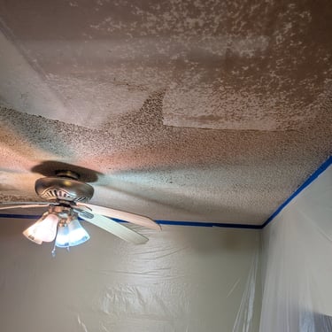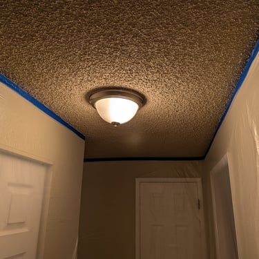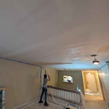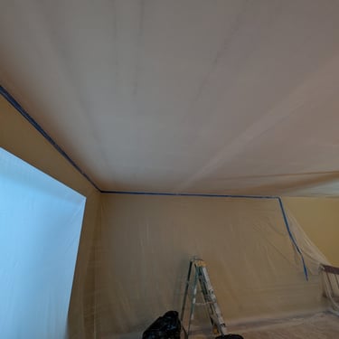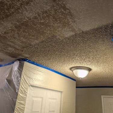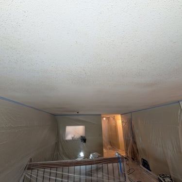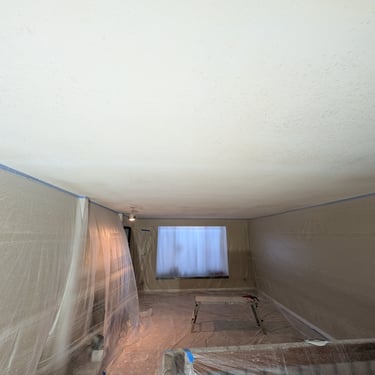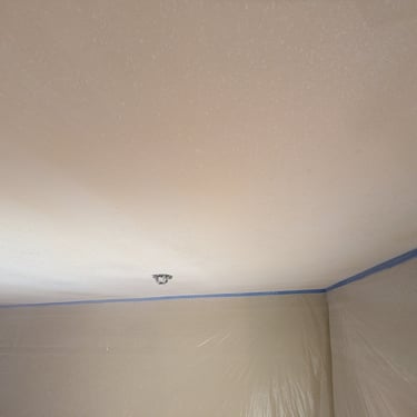"Are you still living with popcorn ceilings? It's time to update your home. In this project, we transformed an entire room by removing the rough texture to create a smooth, sophisticated surface. Professional Removal: We scraped the old texture in a controlled manner, eliminating dust and debris accumulated over decades. Leveling and Smoothing: We applied layers of high-quality joint compound to conceal drywall seams and correct any imperfections. Fine Texture (Orange Peel or Smooth): We finished with a very subtle fine texture that better reflects light, making rooms feel taller, more spacious, and brighter. Paint Finish: We sealed and painted with a pure matte white for a magazine-worthy finish."