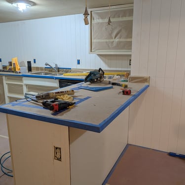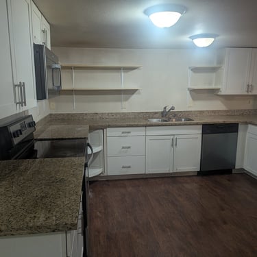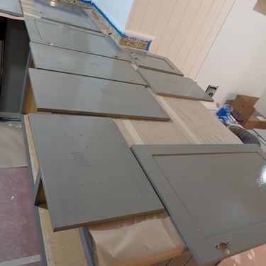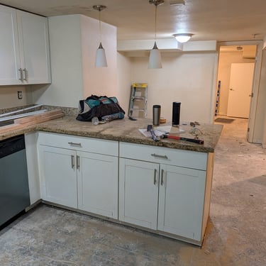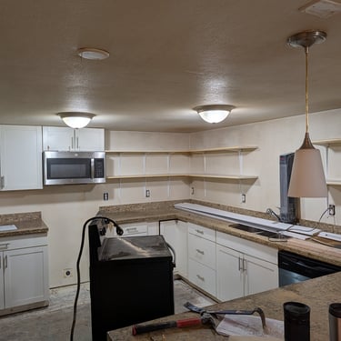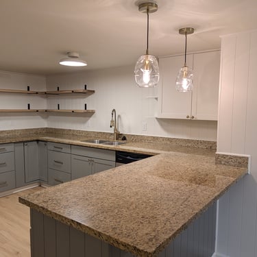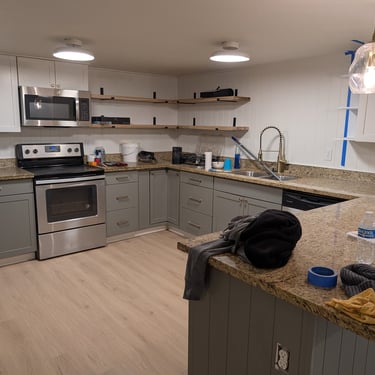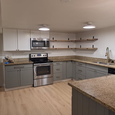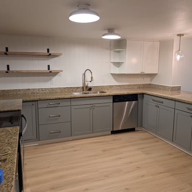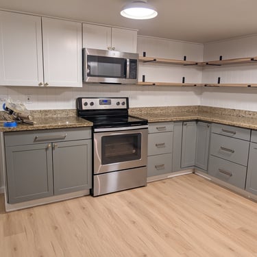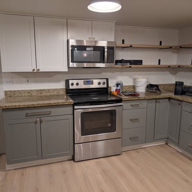 In this project, we carried out a high-impact aesthetic update using a trendy color scheme that adds depth and elegance to the space. 1. The Concept: Modern "Tuxedo" Style We transitioned from a monochromatic white kitchen to a two-tone design (Two-Tone Cabinets). This technique is ideal for: Anchoring the space: Using a darker color on the lower cabinets creates a sense of stability and modernity. Maintaining brightness: The pure white upper cabinets (Shaker style) help the kitchen feel open and spacious. 2. Execution and Finishes Sophisticated Stone Gray: The lower cabinets were painted in a medium gray tone with cool undertones, which perfectly complements the existing granite and the new light wood flooring. Professional Finish: A uniform application with a satin or semi-gloss finish is evident, which not only looks better under LED lighting but also facilitates daily cleaning. Hardware Details: The work was completed with the installation of new stainless steel bar-style handles, in keeping with the contemporary style of the appliances. 3. Integration with the Environment The change in cabinet color highlights other new elements of the project, such as: The white shiplap wall cladding, which now has a more defined texture thanks to the contrast with the gray. The floating shelves in natural wood, which stand out against the clean, neutral background.